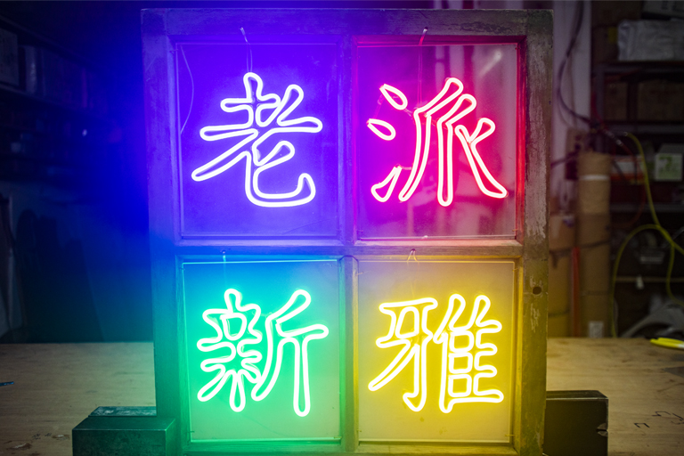 混搭傳統鎢絲燈泡以及軟霓虹燈的文創招牌。