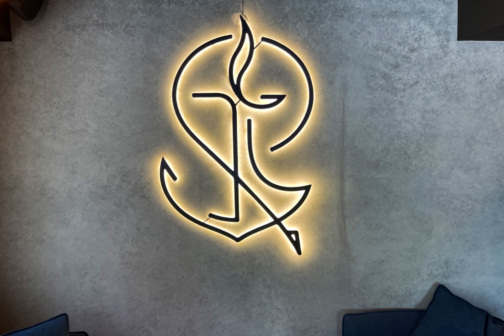 磚牆上的薄型立體燈箱,側邊可發光,均勻的涼白光,營造出品牌的核心視覺效果。